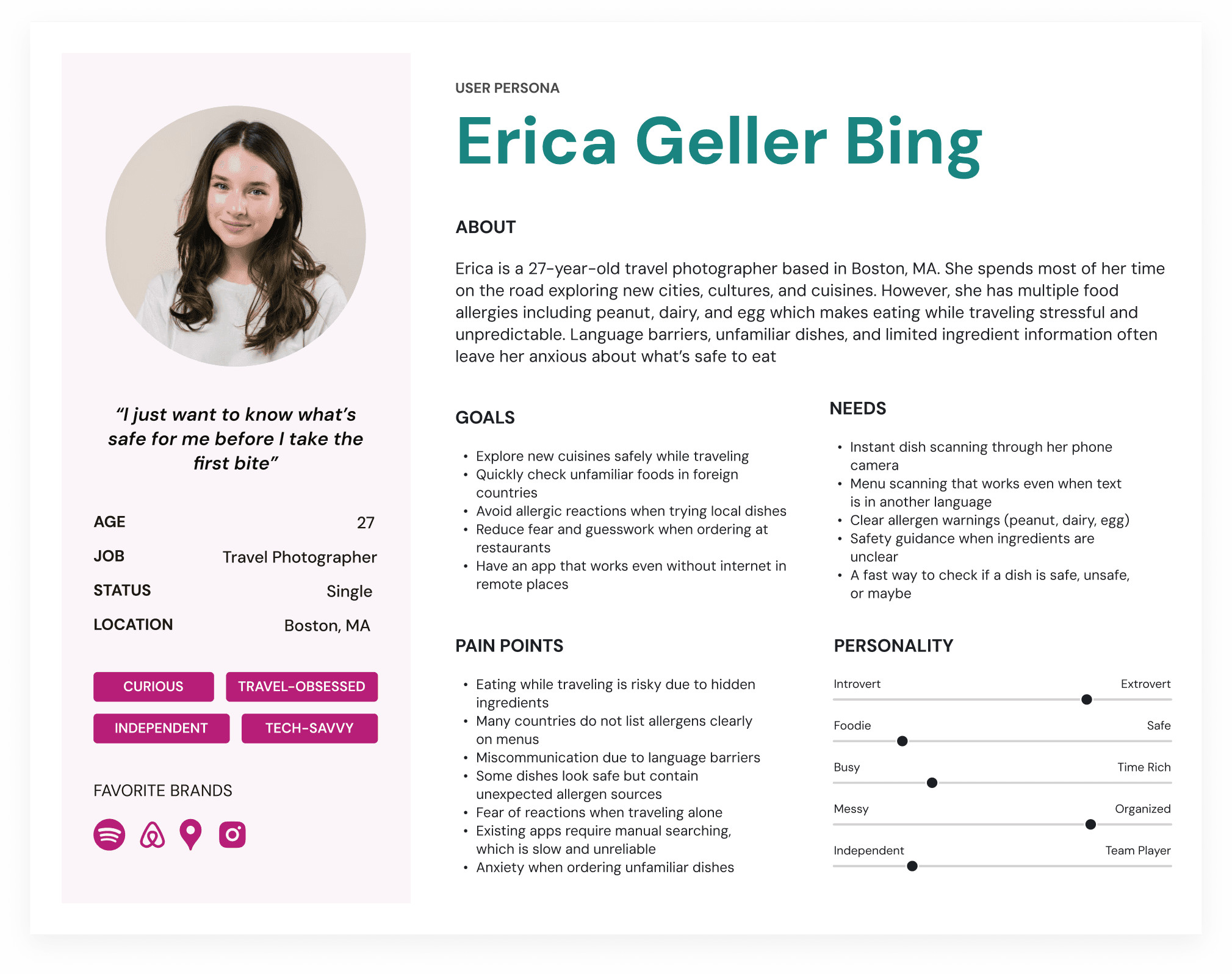 Erica is a frequent traveler with multiple food allergies who struggles to identify safe dishes while abroad. Language barriers, unclear menus, and hidden ingredients make eating risky, and she needs a quick, reliable way to check food safety without depending on the internet.
