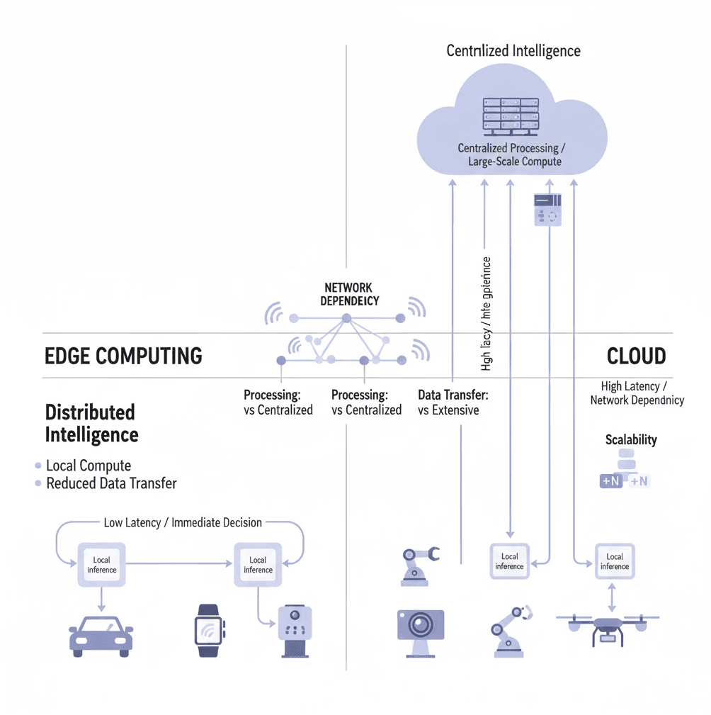 Cloud-based devices send data to remote servers for processing, which can cause delays and make performance dependent on internet connectivity. Edge devices process information locally, allowing them to respond faster and continue working even with weak or no network.